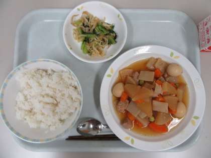 今日は大根と豚肉などをしょうゆ味で煮込んだうま煮です。こんにゃくやうずら卵も一緒に加えて具だくさんな煮物にができあがります。