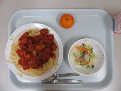なす・ズッキーニなど夏野菜をトマトソースに煮込んだスパゲッティの献立にしました。旬の野菜の食感か楽しめる1品になりましたが、食べやすいミートソースの献立の日と比べると残菜が少し気になりました。今後も旬の食べ物をおいしく食べられるように献立に取り入れていきます。