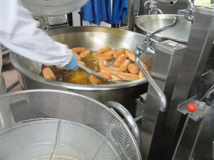 今日はオリ・パラ給食日本です。揚げパンは戦後の学校給食で生まれた献立です。そして今でも人気があります。大きな釜でくるくると回しながら均等に揚げています。