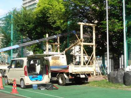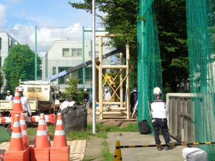 アスレチックの改修が進んでいます。前のアスレチックの柱部分を含め、ほとんどが撤去されましたが、新たな丈夫な骨組が立ってきました。校庭のゴムチップもすべてなくなりました。