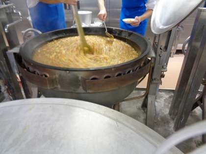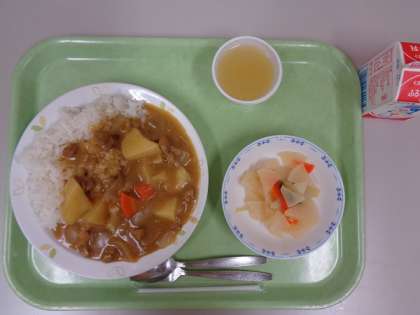 今日は人気献立のカレーライスです。できあがりのカレーの中心温度だけではなく、じゃがいもなどの具の硬さも確認しています。