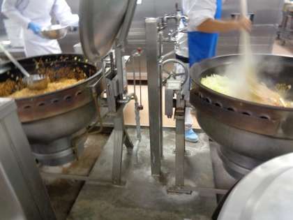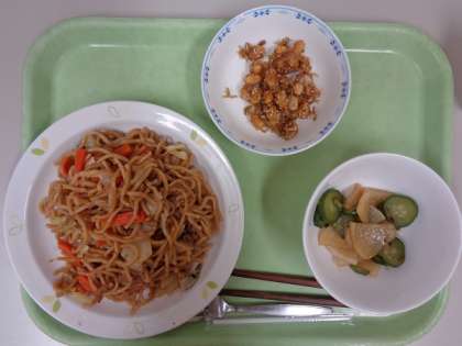ソース焼きそばの具の野菜は1人100g入っています。ソース味でしっかりと野菜を食べられる献立になっています。焼きそばの量は多めなので、2つの釜を使用し調理しました。