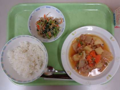 豚そぼろと野菜・こんにゃくと一緒にじゃがいもを煮たそぼろ煮ができあがりました。豚肉のうま味がじゃがいもに染みこみ、児童たちはしっかりと食べていました。