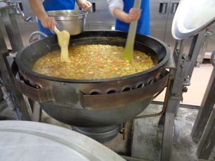 今日は人気献立のカレーライスです。カレールウも給食室でつくられています。じっくり煮込んだ具に少しずつカレールウを加えて、さらに煮込みます。