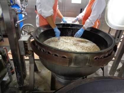 野菜など具だくさんの肉団子汁を調理しています。肉団子の種をつくり、だしに1個ずつ入れています。鉄分補強するため、豚レバーを団子に加えています。
