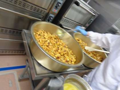 素揚げしたさつま芋とキャラメルソースをあえています。今日のさつま芋は紅はるか、やさしい甘味とキャラメルソースがよく合います。