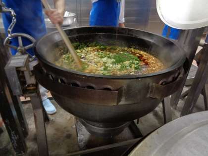 にんじん・ねぎ・大豆などをみじん切りにして具に混ぜた麻婆豆腐をつくっています。最後ににら・ねぎ・ごま油を加えて仕上げをしています。
