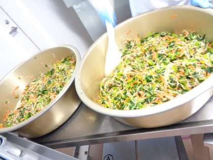 今日のおひたしはすまし汁用と一緒に取ったかつおだしと砂糖としょうゆでタレをつくり、野菜とあえました。盛り付け時におひたしを少なく盛りすぎている児童もいたため、しっかりと野菜を食べましょうと教職員で声をかけました。