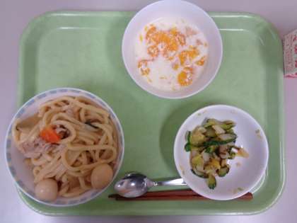 今日は濃厚なかつおだしで味をつけた汁にうどんを煮込んだ五目うどんです。寒さが厳しくなってきた日には温かい料理が一層おいしく感じます。