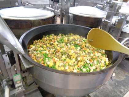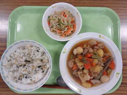 ごぼう・れんこんなど根菜やじゃがいもなどを炒め煮にした炒り鶏を調理しています。最後に下ゆで済のさやいんげんを加えて仕上げます。