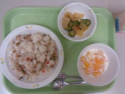 今日はオリパラ給食、インドネシアです。インドネシア料理で有名なナシ(ごはん)ゴレン(炒め)をつくりました。普通のチャーハン見えますが、味付けにはレモン汁・唐辛子が入っています。本格的に辛味と酸味があると食べにくいので、少量を加えて後味に辛味と酸味がわずかに感じる味にしています。