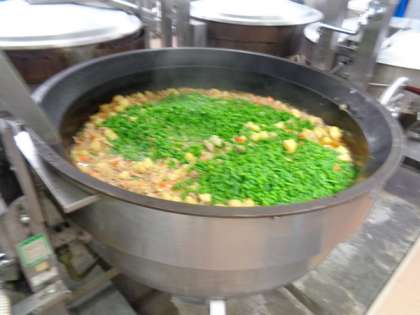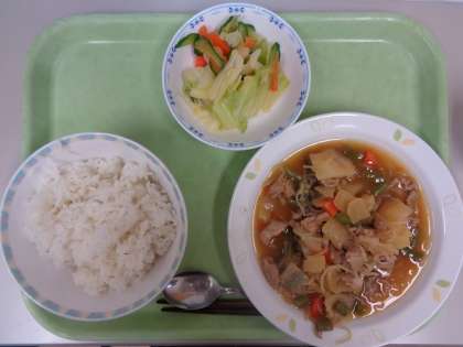 今日は定番献立の肉じゃがです。給食室ではじゃがいもが崩れない様に配慮しながら調理をしています。最後に中心温度を確認して調理終了、盛り付け開始です。