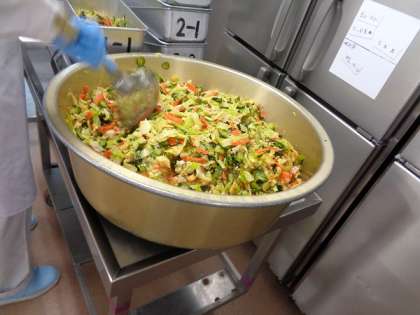 野菜はにんじんなど火の通りにくいものから加熱し、水冷ではなく真空冷却機で冷却します。酸味が効いたドレッシングとわかめをあえて、わかめサラダが完成です。各学級ごとに計量していきます。