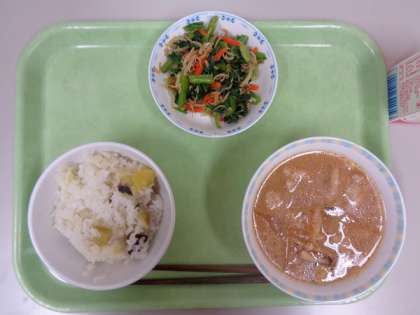 毎月19日は食育の日です。今日は肉団子汁の具の大根と長ねぎはせたがやそだちの野菜を用意しました。さつまいもごはんのさつまいもは、しっとりとした食感のシルクスイートです。おいしく和食を食べられる献立にしました。