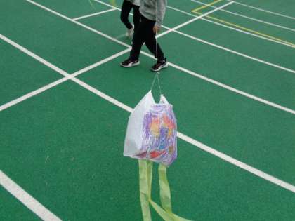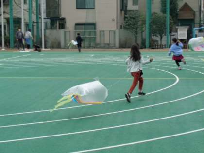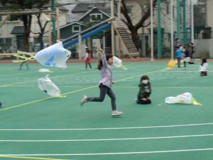 寒い中、1年生が手作りのたこの糸を持って、夢中で走っていました。