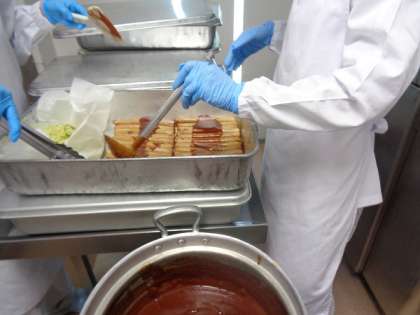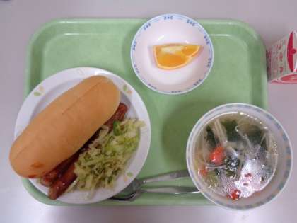 今日は自分でホットサンドをつくる、セルフホットドックです。コッペパンにキャベツソテーとウインナーを自分でサンドしていただきます。ウインナーは無添加物のものを注文しました。蒸し焼きにしたウインナーを各学級ごとに分けて、ソースをかけていきます。