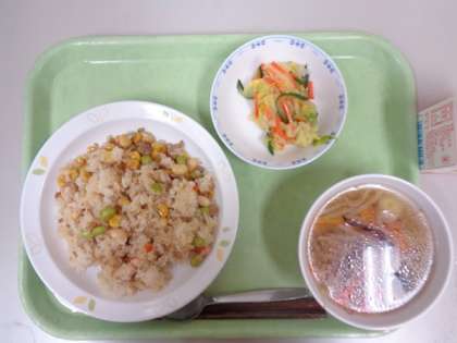 2月3日は節分、豆をまき禍をはらう古くからの行事です。今日は大豆・枝豆を加えたチャーハンです。にんにく醤油味で苦手な豆も食べられる味になっています。
