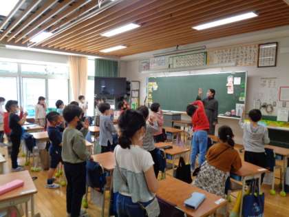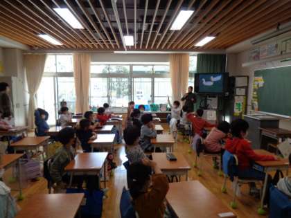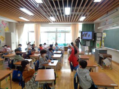 ALTの先生と、英語の学習に取り組んでいました。今日のテーマは、動物。国語で「どうぶつの赤ちゃん」を学習していますが、英語では何て言うんだろう?子ども達は、動物の画像を見ながら「何の動物でしょう?」クイズを通して、楽しく学んでいました。