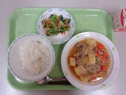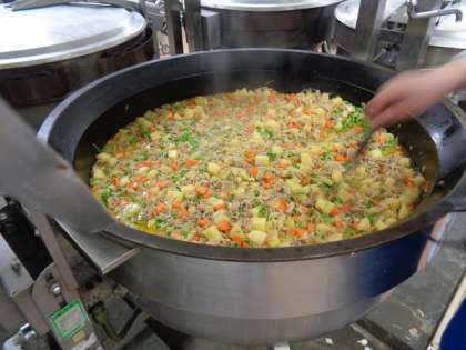 今日は定番献立の肉じゃが、大きな回転釜で調理します。じゃがいもが崩れない様に優しく混ぜながら、味を整えて完成です。