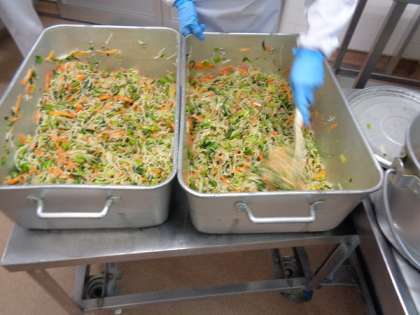 今日の副菜はごま塩ナムル、から炒りしたごまと塩とタレをしっかりとあえています。味が均等になるまで混ぜて、できあがりです。