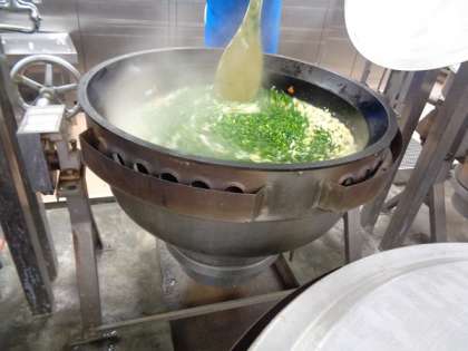 鶏ひき肉・しょうが・ねぎなどを練り団子状にしたものを、だしで煮込んだつくね汁ができました。最後に葉ねぎを加えてできあがりです。