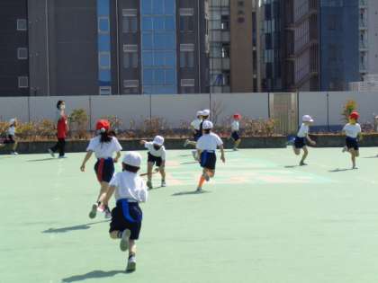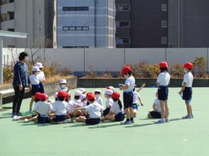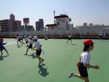 晴れた日の体育の時間。1年生が屋上運動場でしっぽとりゲームをしていました。春を感じる暖かい日で、運動場を元気に走り回っていました。