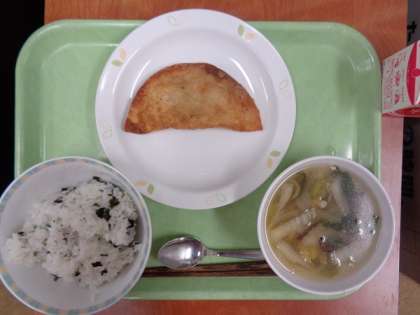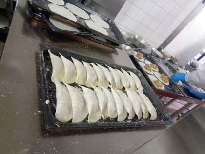 今日は人気献立のジャンボ餃子、皮は業者さんに特注で購入しました。1枚ずつあんを入れて、水溶き小麦粉でしっかりと糊付けしています。