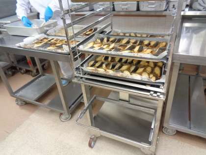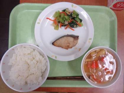 春が旬の魚、鰆(さわら)を梅醤油ダレに漬けて焼きました。梅干しの酸味はほとんど無く、さっぱりとした味になっています。焼き上がったら各学級ごとの食缶に入れていきます。