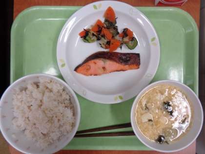 とろみをつけたすまし汁にゆっくりと溶き卵を加えたかき玉汁です。豆腐・わかめなどの具がたっぷりと入っていましたが、子ども達はしっかりと食べていました。