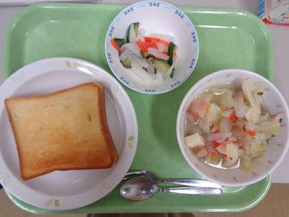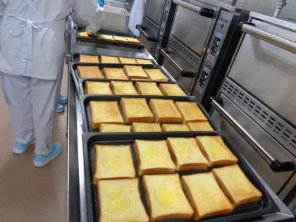 バターとグラニュー糖を混ぜてペーストをつくり、食パン1枚ずつ塗っていきます。オーブンに入れて焼き、できあがりです。低・中・高と食パンの大きさが異なるため、同じ大きさごとに鉄板に入れて焼きました。