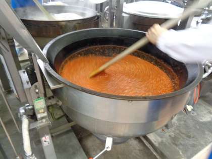 豚肉や野菜などを炒め、トマト缶などを加えて煮込み酸味を飛ばしてミートソースをつくります。向かいの釜ではスパゲティをゆでています。調理完了時間を考えて給食室では作業をしています。