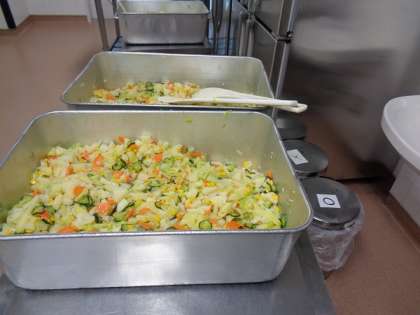 フレンチサラダに茹でたじゃがいもを混ぜた、ポテト入りフレンチサラダの完成です。混ぜやすい器に均等に分けて、味ムラがないように混ぜています。