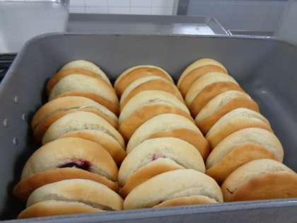 2つ折り形状のパンにジャムを塗り各学級ごとに分けています。2つ折のパンなので持ちやすいジャムサンドになっています。