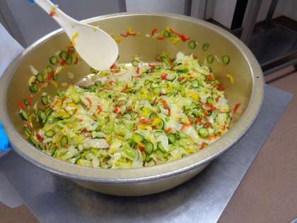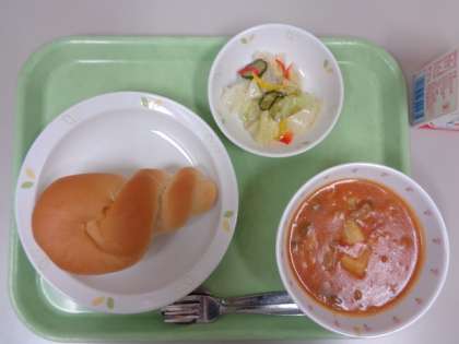 今日は赤ピーマン・黄ピーマンを加えたカラフルなサラダにしました。赤ピーマン・黄ピーマンは甘味があるのですが、緑ピーマンが苦手な児童がピーマンを多く残していました。