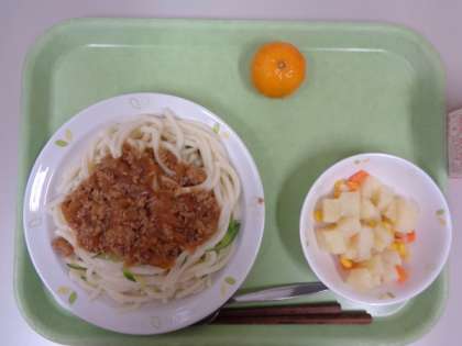 明日は児童・教職員が頑張って準備してきた運動会です。給食室から応援の気持ちを献立にしました。具だくさんの肉みそを冷やしたうどんにかけて食べるジャージャーうどん・人気がある冷凍みかんは全校の児童はしっかりと食べていました。肉みそ・うどんゆで・冷やしと多くの釜を使い調理します。