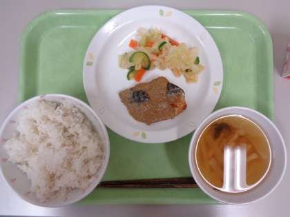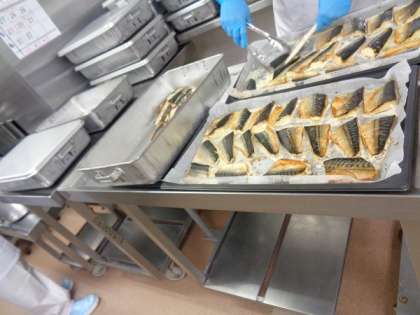 みそダレに炒りごま・すりごま・練りごまを混ぜたごまだれをサバにかけた、ごまだれかけです。各学級の魚の数が間違えないように複数の調理員さんで確認をしています。