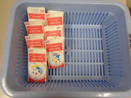 飲み終わった牛乳パックは軽く水ですすぎをしたのちに折り畳み、各学級ごとにリサイクル用バケツに入れます。未開封の牛乳も同様です。職員室で給食を食べる教職員も同じく水ですすいでから畳んでいます。