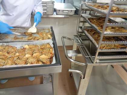 魚に香味ダレを漬け、焼き始める直前にごまをまぶして焼いた香味焼きです。にんにく・しょうがの下味が香ばしく、この味を好む子ども達も多くいます。