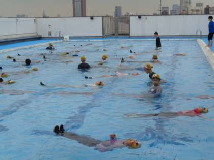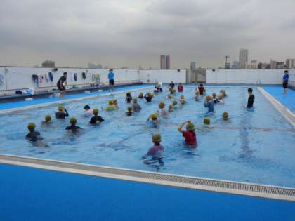 夏休み前に、5,6年生が着衣泳の学習をしました。服を着たまま、水の中でできるだけ長く浮くためにはどうしたらよいかを学びました。