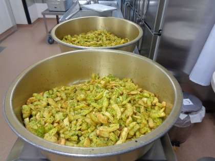 鶏南蛮うどんは、冷やしたうどんに温かい汁をつけて食べる料理にしました。のり塩ポテトで使用するじゃがいもは66kg、数回に分けて素揚げして味をつけました。