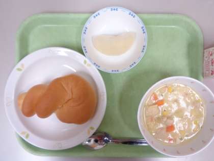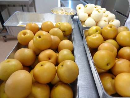 今日の果物は梨、豊水です。ジューシーな果肉がおいしい梨を皮むきしています。給食業者さんから立派な梨が届きました。