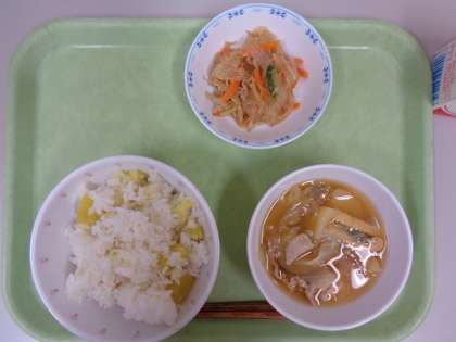 毎月19日は食育の日です。給食は生きた教材、給食の時間は食べて学ぶ食育の時間です。今日はこれからが旬のさつまいもを米と一緒に炊きました。薄めの塩味がさつまいもの甘みを引き立てる1品です。