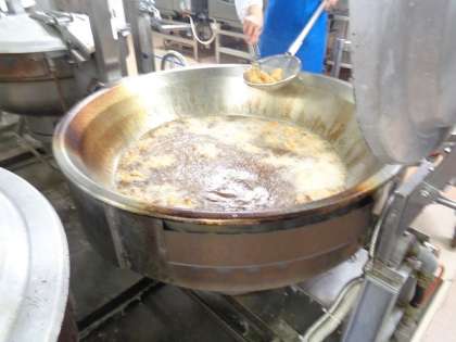 今日は醤油ダレにつけたホキに片栗粉をまぶして揚げた竜田揚げです。油を加熱した大きな釜に、魚を入れて、カラッと揚げています。