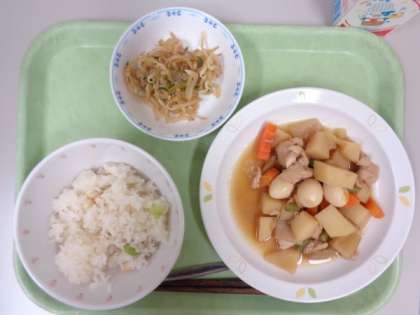 今日は豆ごはんです。もち米も加えて炊き、モチモチとした食感と塩味で豆をおいしく食べられる1品にしました。