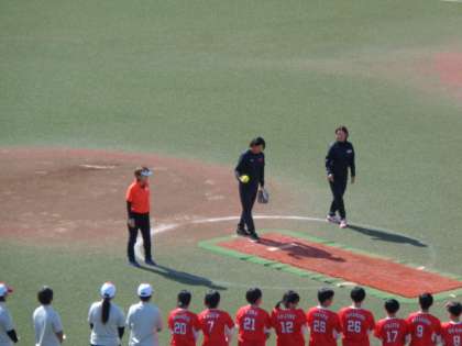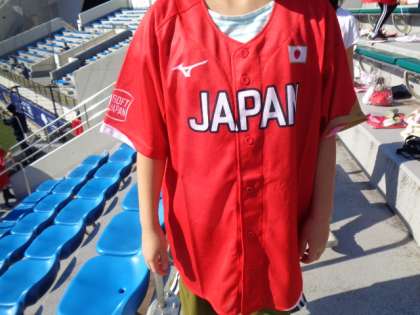 気持ちの良い秋晴れの中(かなり暑かったです)、U15女子ソフトボール、日本対ニュージーランドの試合を観戦してきました。日本は9本のヒット、ノーエラーで7−0のコールド勝ちでした。真っ赤なJAPANのユニホームをいただき、子どもたちは一生懸命応援していました。始球式は、あの日本代表の上野投手!とても貴重な体験ができました。