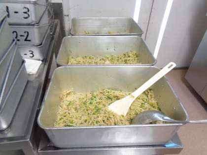 今日は保護者の方々から多く問い合わせがあった、ごま酢あえです。タレであえると野菜から水分が出るので、数回に分けて水分を取りながら「タレをあえます。