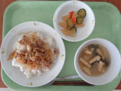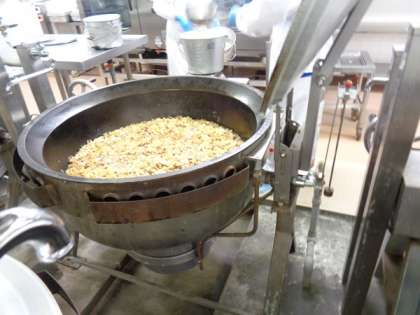 野菜、しらたきなど具だくさんな豚丼の具ができました。中心温度を測定後、総量から計算された配缶表をもとに各学級に配缶していきます。