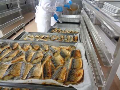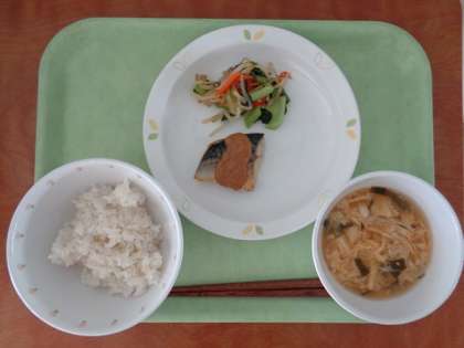 しょうが・酒で漬けたさばをオーブンで焼き、各学級ごとに数えた後にごまだれをかけています。練りごま・すりごま・いりごまが入っている濃厚なタレでおいしく魚を食べられます。