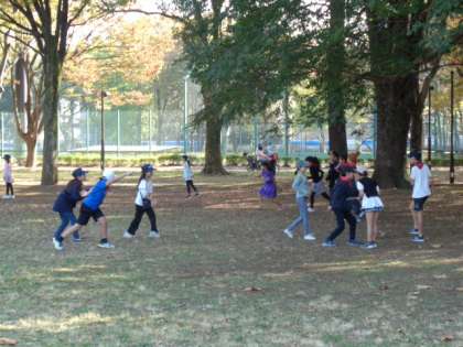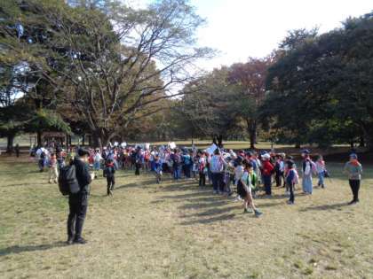 延期していた遠足。その分最高の天気に恵まれ、砧公園に行ってきました。行きは徒歩、帰りは電車を使いました。電車での態度もすばらしかったです。砧公園では、3,4年生混合の班で活動しました。落ち葉などを使って作品を作るアート大会をしたり、班遊びをしたりしました。気持ちのいい疲れで、大満足の遠足でしたね!