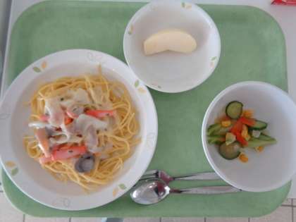 今が旬のりんごにはふじ・王林など皮の色も違う様々な種類があります。今日は長野県産のシナノゴールド、黄色いりんごを皮むきしています。